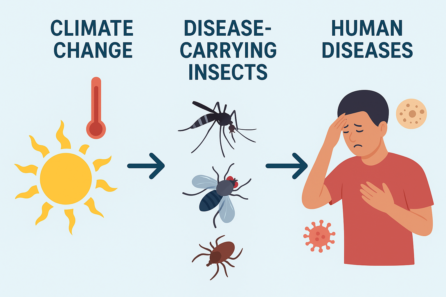 تغییرات اقلیمی از طریق اثرگذاری بر جمعیت، چرخه زندگی و پراکنش جغرافیایی حشرات ناقل بیماری‌ها، سلامت انسان و حیوان را به‌طور فزاینده‌ای تهدید می‌کند. بسیاری از بیماری‌های عفونی مهم در انسان مانند مالاریا، تب دنگی، زیکا، تب زرد و لیشمانیوز، وابسته به ناقلان بندپای هستند که چرخه زیستی آن‌ها به‌شدت از شرایط اقلیمی متأثر است. افزایش دما، تغییر بارش و رطوبت، و نوسانات فصلی، محیط‌های مساعدتری برای رشد و تکثیر این ناقلان فراهم می‌کند.